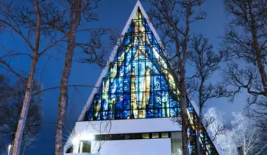 کلیسای منطقهی ترومسو، که به کلیسای قطب شمال معروف است، در شهر ترومسو یک شاهکار مدرن به حساب میآید. ظاهر ساده و شیک آن که بازتابی از مناظر اطراف است و یادآور خانههای سنتی سامیهاست، با فضایی داخلی که راحتترین نیمکتها را دارد، تکمیل میشود. اثر هنری شیشهای خیرهکنندهای با عنوان «بازگشت مسیح» در یک سمت، شاید برای همه خوشایند نباشد، اما به نظر من، قدرت و شکوه خاصی دارد. خروج از این بنای باشکوه پس از یک اجرای ارگ، و مواجهه با شفق قطبی که در آسمان میرقصد، تجربهای شگفتانگیز بود.