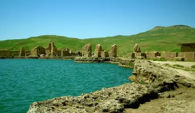 در شمال غربی دریاچه، ایوان خسرو قرار دارد که بهاحتمال زیاد در زمان خسرو اول، معروف به انوشیروان، ساخته شده است. این ایوان با معماری باشکوه خود، نمادی از عظمت دوره ساسانی است و بقایای آن هنوز هم شکوه خاصی را به نمایش میگذارد. همچنین، معبد آناهیتا در جنوب شرقی دریاچه واقع شده که به الهه آبها و باروری اختصاص داشته و محل برگزاری مراسم مذهبی بوده است.