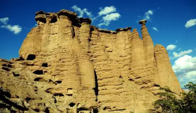 قلعه بهستان (تصویر شماره 3) که یک مجموعه بزرگ از هودوها است، اکنون در مقابل شما ایستاده. اگر روستا و باغها را رد کنید و راه خود را مستقیم به سمت قلعه ادامه بدهید، به کناره رودخانه قزلاوزن میرسید که دقیقا زیر پای قلعه بهستان جاری است. اینجا محیطی است که سازمان میراث فرهنگی برای گردشگر ها و میهمانانی که میخواهند در هنگام سفر استراحت کنند تعدادی آلاچیق آماده کرده. خبر خوب برای عکاسان و گردشگران این است که این منطقه یکی از جاهایی که میتوانید در آن عکسهای یادگاری خوبی از خود و قلعه ثبت کنید. اگر مایل هستید بیشتر به این اثر نزدیک شوید و همینطور برای دیدن بیشتر آثار قلعه و اطراف آن، سوار ماشین شوید و راه خاکی کوتاهی که در مسیر، طی کرده بودید را برگردید و به محض رسیدن به آسفالت، آن راه را به سمت چپ ادامه دهید، بعد از رد شدن از پلی فلزی، سمت چپ شما یک راه خاکی شیبدار قرار دارد که مستقیما به سمت قلعه بهستان میرود. بعد از اینکه به قلعه رسیدید میتونید ماشین را همانجا پارک کنید و برای بازدید از قلعه بروید، فقط باید اینجا موضوعی را به شما متذکر شوم، هودو ها به خاطر تشکیل شدنشان در بافت خاکهای رسوبی به راحتی فرسایش پیدا میکنند و بافت خیلی سستی دارند. پس در زمان بازدید، سعی کنید اصلا به پرتگاهها یا جاهاییکه به آن دید ندارید، نزدیک نشده و قدم های خود را خیلی با احتیاط بردارید. چون به خاطر باد و باران بافت این خاک حتی از سالی به سال بعد میتواند خیلی تغییر کرده و کاملا سست شود، پس خیلی مراقب خود باشید. در توضیح و تحلیل قلعه باید بگویم، این عارضه طبیعی همانطور که پیشتر اشاره کردم، از تعداد زیادی هودو که بهم چسبیدهاند، تشکیل شده و خود این هودو ها میلیونها سال طول کشیده تا به خاطر فرسایش خاک بر اثر باد و باران به وجود بیایند. بعد از به وجود آمدن این هودوها مردم بومی منطقه از دوره امپراطوری ماد متوجه پتانسیل آن برای ایجاد استحکامات دفاعی شدند و از همان دوره شروع به حفر راهروها و اتاقهایی درون این بافت کردند تا از آن به عنوان یک قلعه دفاعی در مقابل دشمنانشان و کسانیکه به آنها حمله میکردند، استفاده کنند. این موضوع تا دوران میانی اسلام، ادامه داشته و از این مجموعه به همین منظور استفاده شده است. شاید بد نباشد اشاره کوچیکی هم کنم به این موضوع که دوران میانی اسلامی در ایران مقارن با هجوم مغولها به کشورمان است و در آن دوره در خیلی از جاهای ایران که بافت طبیعی خاک به مردم اجازه حفر تونل و پناهگاه میداده، این مکانها بدست مردم آن زمان برای دفاع در مقابل حملهها ایجاد شده و در خیلی از جاهای کشورمان شهرهای زیرزمینی و تشکیلات دفاعی مثل این را که داخل زمین حفر شدهاند، داریم.